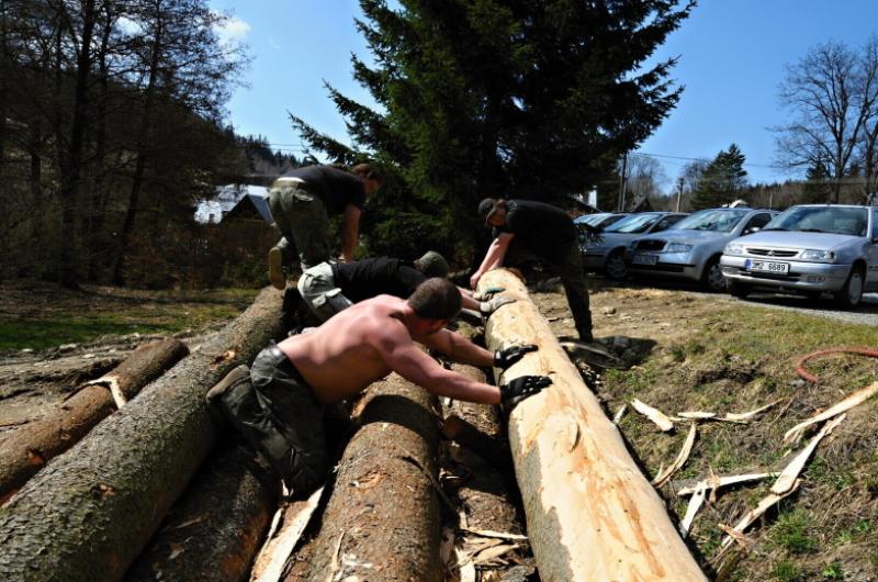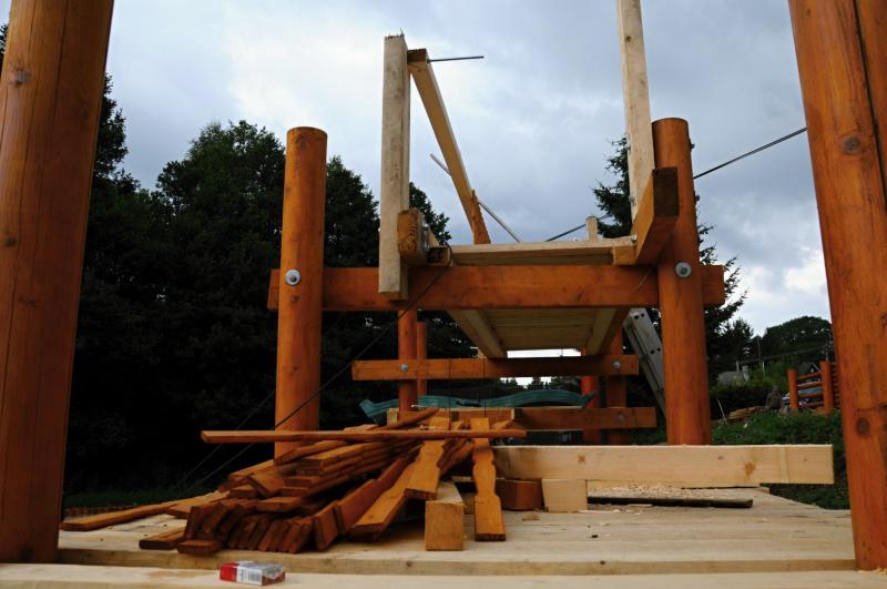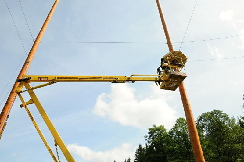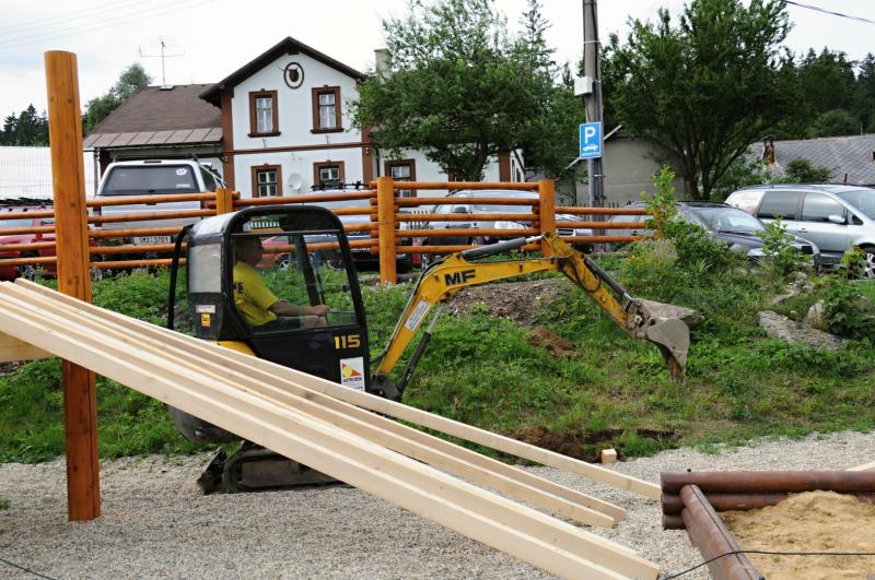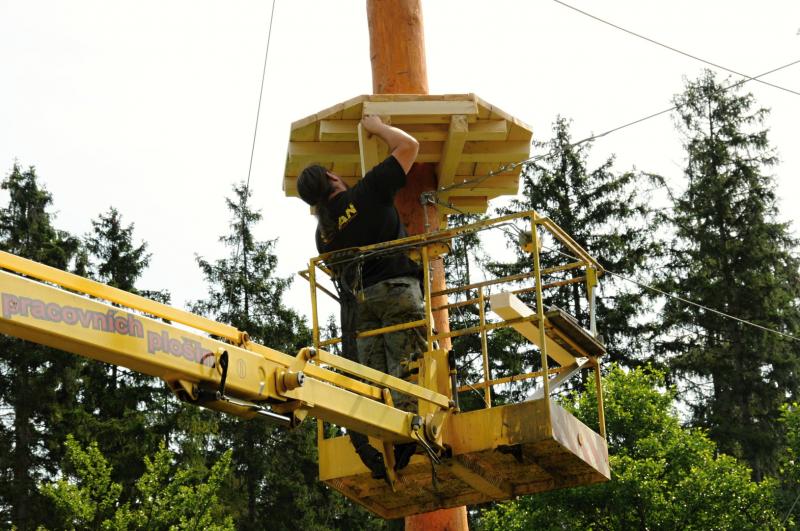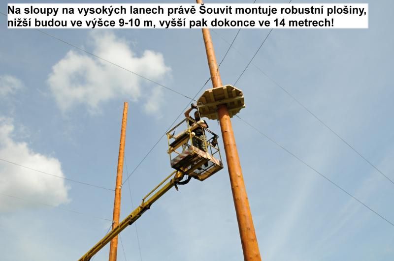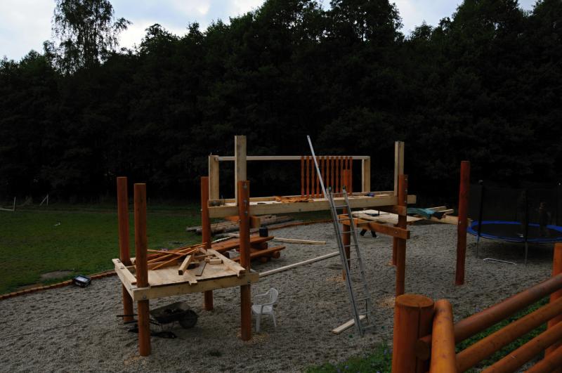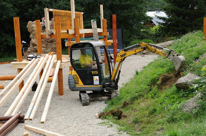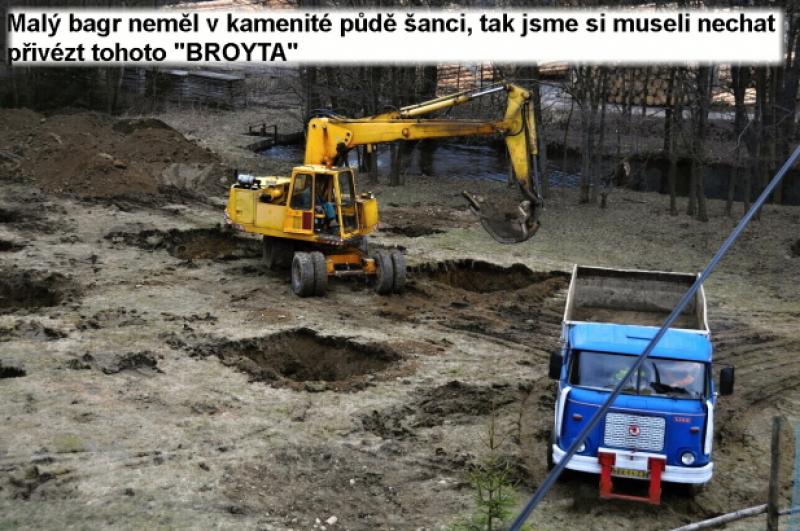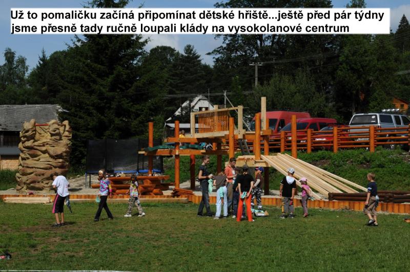 Kde jsme to přestali? Aha...jak se bagr zakousl do země...zakousl, a málem si zuby vylámal...zjistili jsme, že už půl metru pod hezkým trávníkem se ukrývají balvany, na které tento malý bagr stačit nebude...tak jsme si nechali přivézt "BROYTA", což je bagr jiné váhové kategorie, který se jen tak před něčím nezastaví...ony totiž patky na toto vysokolanové centrum nejsou len tak ledajaké...však jsou do nich také kotveny sloupy o délce téměř 18 metrů! Ano, jedná se o nejvyšší lanové centrum, které jsme dosud stavěli, a nevíme v republice o žádném, volně stojícím, které by bylo vyšší.