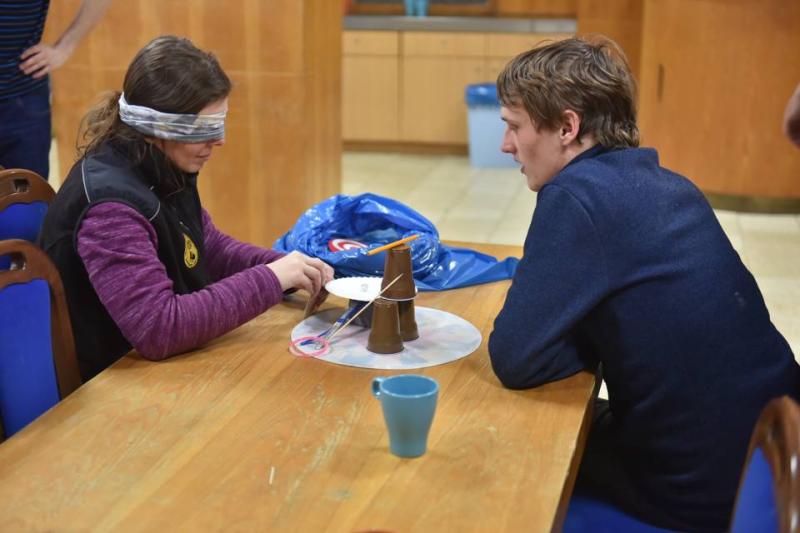 V pátek podvečer se všichni účastníci postupně slezli na Relaxe, kde nás po večeři čekala praktická ukázka indoor her. Na začátek jsme si procvičili své pantomimické, řečové a hmatové dovednosti u oblíbené hry Stavitelé, ve které se slepý dělník snaží postavit dle pokynů stavbyvedoucího, který mu slovně vysvětluje, co má dělat. Stavbyvedoucí přijímá pokyny od architekta, který však nemůže mluvit - tedy pomocí pantomimy vysvětluje, co se má stavět, jako jediný totiž zná zadání.