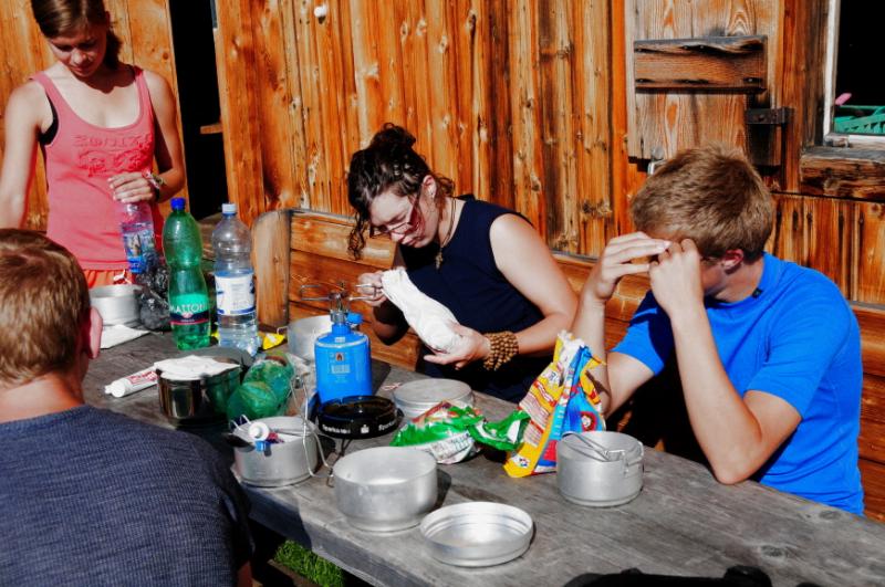 Když už se všichni konečně napapají, začínáme přemýšlet, u jaké chaty jsme se to vlastně zakempovali. Za chvíli vyrážíme na obhlídku. A naše zjištění je velmi příjemné. Chata má totiž velmi milého obyvatele, pravého tyrolského horala, který nám vysvětluje, že u něj v chatě můžeme zadarmo přespat, použít jeho kuchyň, posedět jak dlouho budeme chtít...Když se divíme jeho srdečnosti, vysvětluje nám, že se svojí malou horskou chatou s maličkou hospůdkou si dost vydělá na bohatých němcích, kteří sem chodí a hrají si na horské turisty, ty že oškube velmi rád, ale výpravy jako je naše, na těch nepotřebuje a nechce vydělávat....tolik volný překlad, kdyby byl překlad doslovný, bylo by to jistě čtivější, ale vzhledem k tomu, že pán používal při komentování obtloustlých turistů z Německa dosti specifické výrazy, nebudeme se do doslovného překladu pouštět, a čtenář si jistě sám domyslí.