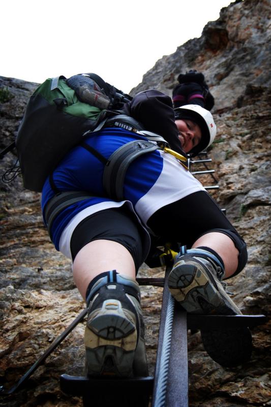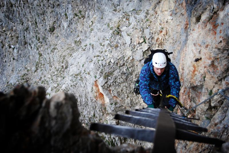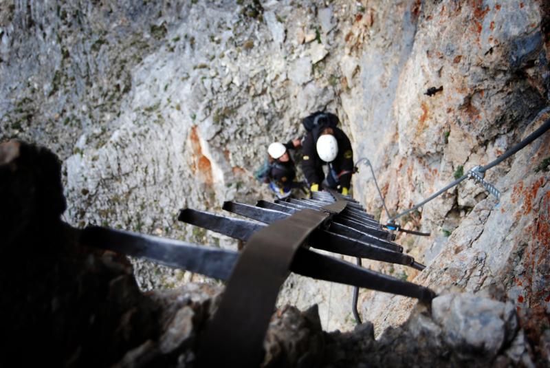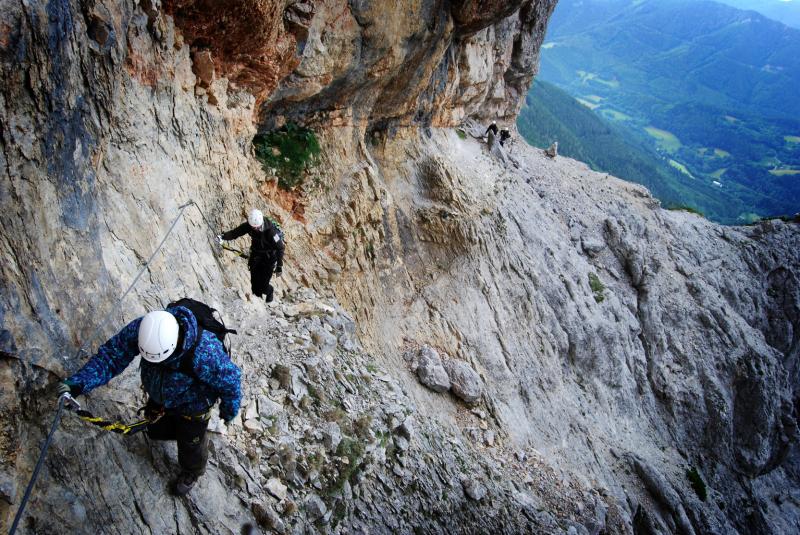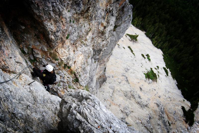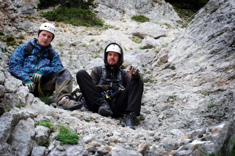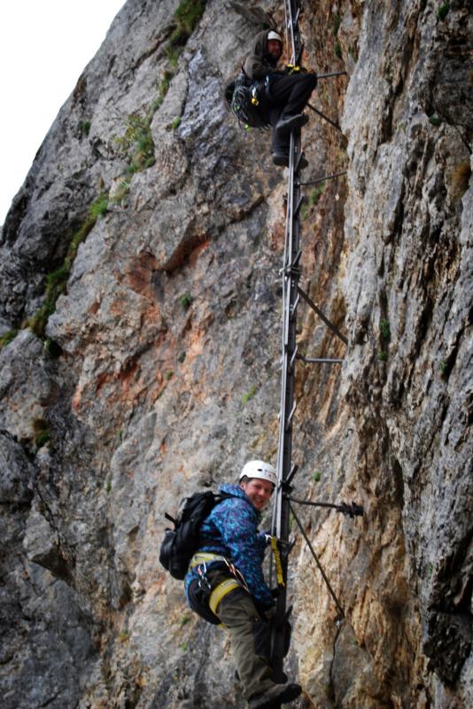 Na liduprázdném parkovišti jsme se najedli, přebalili věci, mokré spacáky nacpali o odpadkového pytle a zabouchli v autě, kolem 8:30 jsme za mrholení vyrazili vzhůru po pěšině křižující silnici. Od parkoviště u Griesleitenhofu (843 m.n.m.) nám trvalo asi hodinu a třičtvrtě než jsme došli pod nástup ferraty Hans von Haidsteig (C/D), zde již nemrholilo, ovšem o to větší vítr foukal :-) Navlékli jsme se do úvazků, přileb, nachystali ferraty a vzhůru! Skály již byly ofoukané a převážně tedy suché, na některých místech je asi mokro celoročně, a tedy i dnes. Stoupáme a fearrata končí..., co to? To byla jen příprava na "žebřík do kurníku" (stromovitý žebřík), který nás hned poté uvítal, pak jsme se želez (mnohdy ohnutých kramlí) a mokrých ploten nezbavili až ke krásně úzkému a klouzavému komínku, kde jsme batůžky drhli a báli se (zvláště tedy ženská část výpravy), aby se nám zadnice v tomto úzkém průchodu nezasekly a my tam nezůstaly trčet :-) Dolezli jsme až k černé sošce Madony, kde ukrutně fučelo, a tak jsme po nezajištěné cestě spěchali dále, do závětří.