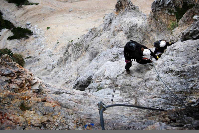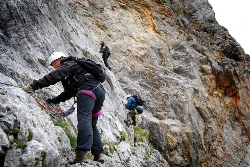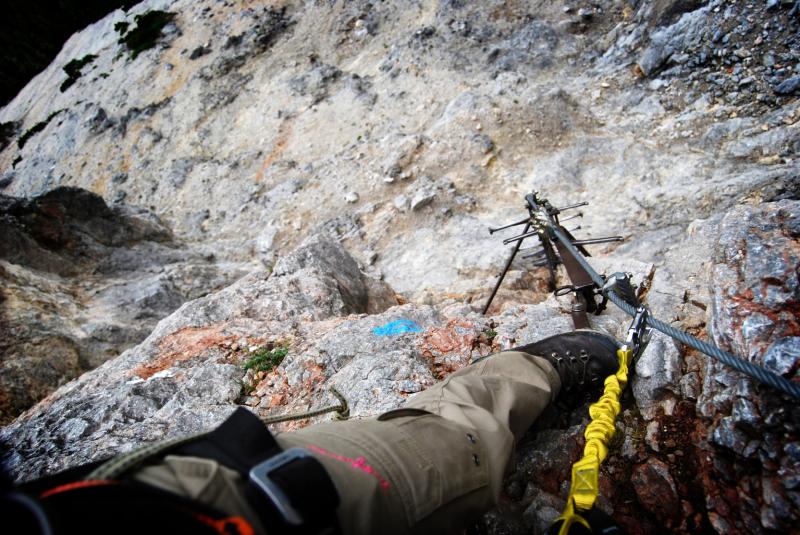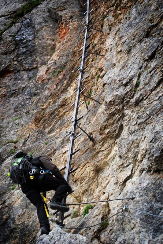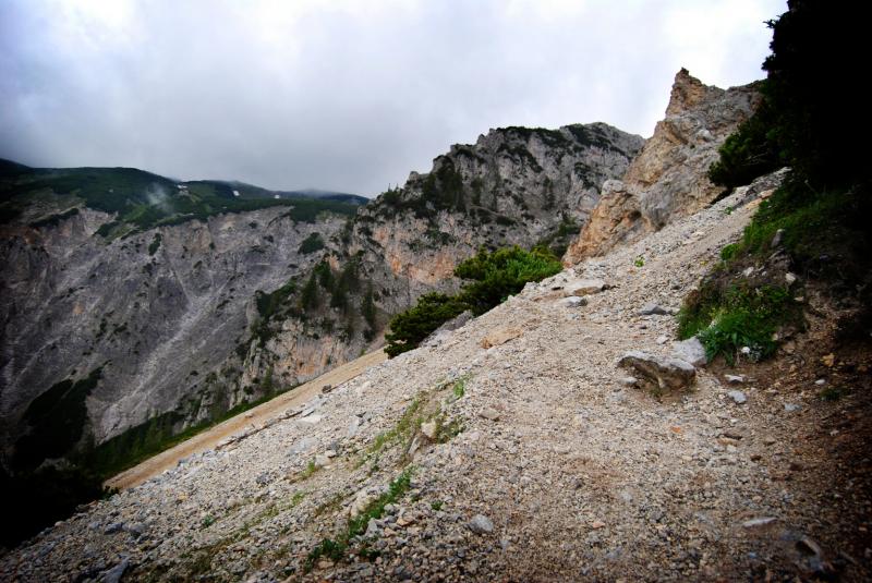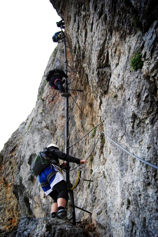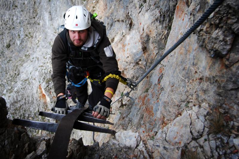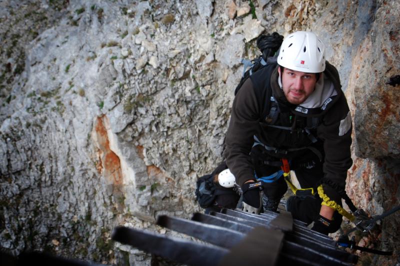 Na liduprázdném parkovišti jsme se najedli, přebalili věci, mokré spacáky nacpali o odpadkového pytle a zabouchli v autě, kolem 8:30 jsme za mrholení vyrazili vzhůru po pěšině křižující silnici. Od parkoviště u Griesleitenhofu (843 m.n.m.) nám trvalo asi hodinu a třičtvrtě než jsme došli pod nástup ferraty Hans von Haidsteig (C/D), zde již nemrholilo, ovšem o to větší vítr foukal :-) Navlékli jsme se do úvazků, přileb, nachystali ferraty a vzhůru! Skály již byly ofoukané a převážně tedy suché, na některých místech je asi mokro celoročně, a tedy i dnes. Stoupáme a fearrata končí..., co to? To byla jen příprava na "žebřík do kurníku" (stromovitý žebřík), který nás hned poté uvítal, pak jsme se želez (mnohdy ohnutých kramlí) a mokrých ploten nezbavili až ke krásně úzkému a klouzavému komínku, kde jsme batůžky drhli a báli se (zvláště tedy ženská část výpravy), aby se nám zadnice v tomto úzkém průchodu nezasekly a my tam nezůstaly trčet :-) Dolezli jsme až k černé sošce Madony, kde ukrutně fučelo, a tak jsme po nezajištěné cestě spěchali dále, do závětří.