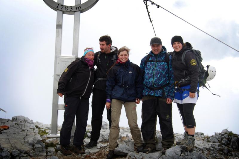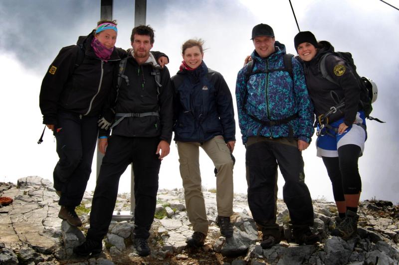 Poté už zbývala jen lehčí část, zakončená traverzem, odkud jsme se napojili na pěší cestu a vystoupali kousek k vrcholovému kříži na Preiner Wandu (1783 m.n.m), vyfotili společné vrcholové foto v mlze a šupali dolů. Cestou nemohla chybět zastávka na chatě Neue Seehütte , kde jsme si dali pivo (kluci říkali, že děsné) a Almdudlera. Cesta zpátky ubíhala rychle, byli jsme rádi, že počasí přecejen vyšlo, navíc se dělalo čím dál krásněji, a tak jsme po šesti hodinách od doby, kdy jsme vyrazili, došli na parkoviště nacpané auty k prasknutí, za urputného svitu sluníčka. Vytáhli jsme mokré spacáky a karimatky, sušili, svačili, pospávali a bylo nám krásně...