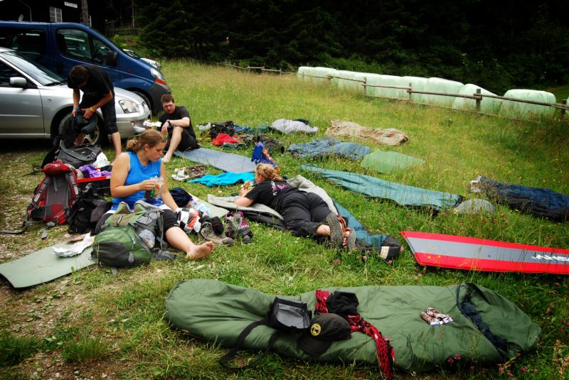 Čím víc jsme se blížili k cíli, tím horší to bylo s počasím, ale co už, asi ve 2 hodiny ráno nás Lišák dovezl až k závoře, která nás donutila zastavit a pokusit se spát, ale 5 lidí se v autě nevyspí, tak jsme vytahali spacáky a karimatky do lehkého kapání a snažili jsme se usnout. Zvyšující se intenzita i velikost kapek, padajících nám do obličeje, však této myšlence příliš nepřála, a tak jsme se vrtěli, sjížděli z mokrých karimatek a někteří se třásli v promočených spacácích. Radost vždy propukla, když se na zatažené obloze podařilo některé hvězdě problesknout a my ji viděli...Věřili jsme, že se ráno nebudeme muset sbalit a jet domů...