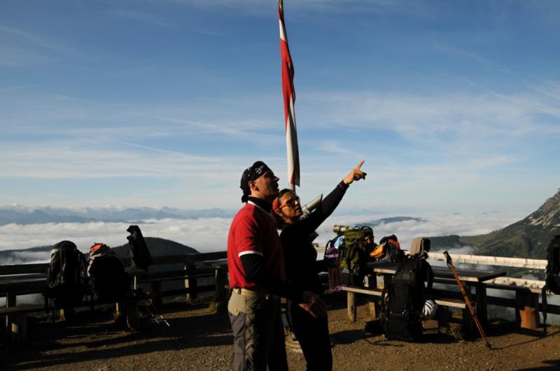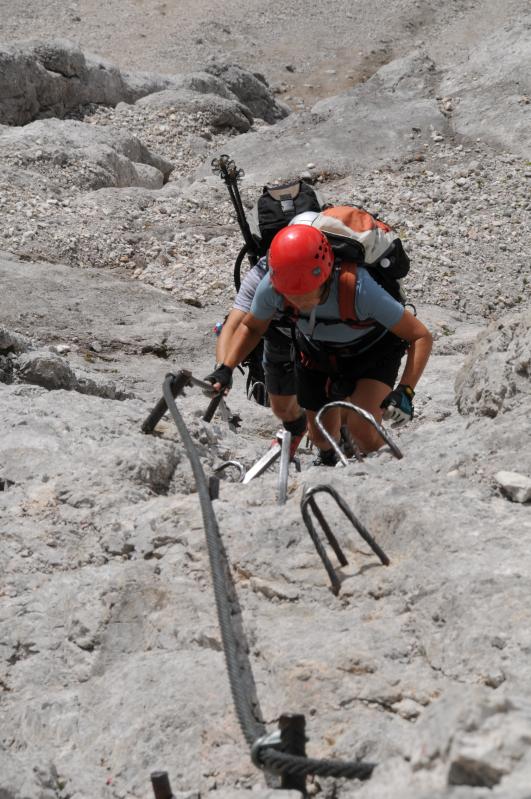 Pro většinu účastníků z řad pedagogů to byla první zkušenost s ferratovým lezením. Startovním místem pro nás byl Hotel Türnwald, nedaleko od Ramsau, ve výšce 1680m.n.m.Odtud jsme pokračovali na Dachsteinsüdwand hütte, kde se cesty rozcházejí a jedna pokračuje k nástupu na ferratu. Došli jsme tam asi po hodině, ferrata je výborně zajištěná, dojištěná kramlemi a vždycky je kam stoupnout, je tedy vhodná i pro začátečníky. Nejhorších je asi posledních 10 m. pod lanovkou, kde není skoro žádné jištění a sypou se zde kameny, toto místo je však možné obejít po normální cestě. Od horní stanice lanovky (2613m.n.m) jsme pokračovali po ledovci k Seetheler hütte, kde jsme postavili stany a přenocovali. Ráno odcházíme na ferratu obtížnosti C, její začátek není vůbec jištěný, protose přecvakáváme mezi kramlemi. Po několikahodinovém lezení opravdu dosahujeme vrcholu Hoher Dachsteinu (2995 m.n.m.). Když jej přejdeme, klesáme po jednodušších ferratách směr Adamek Hütte. Ferraty končí, pokračuje se po rozpukaném ledovci a později po normální kamenité cestě, která nás zavede až k chatě (2196m.n.m.), kde přespíme. Ráno nás čeká dlouhý sestup v mlze až k dolnímu jezereu Gosausee (933m.n.m.).